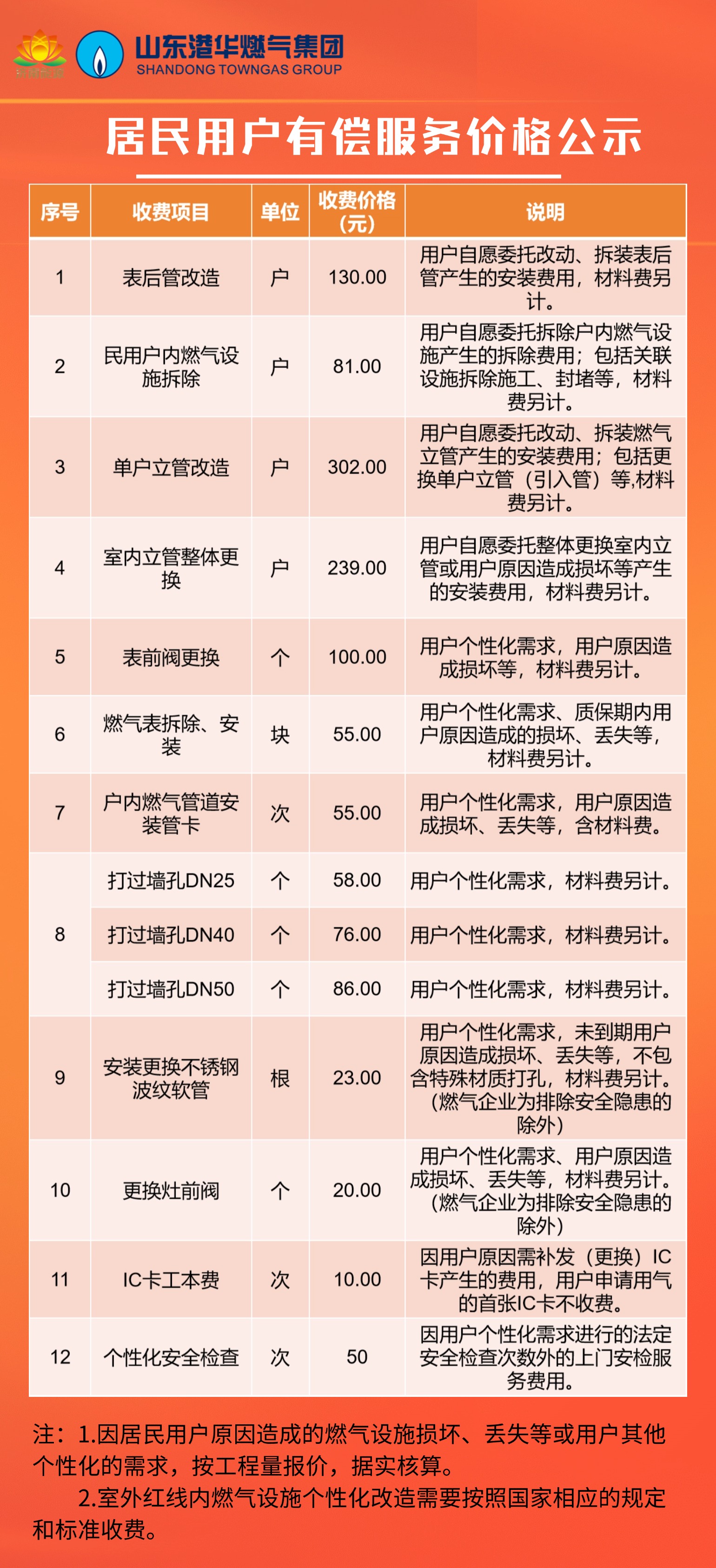 居民用户有偿服务价格公示